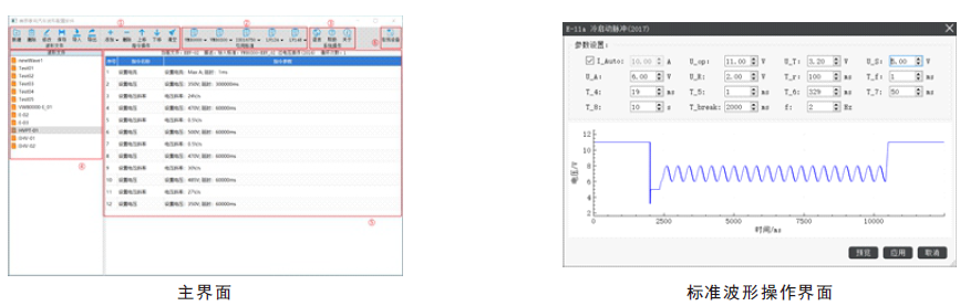 FTP032-C系列、FTG-C系列以及FTB9000-C系列电源可实现ISO16750-2(道路车辆电气电子设备的环境条件和试验第2部分:电气负荷)、LV124、LV148、SAEJ1113-11、ISO21848以及大众VW80000电气、电子设备测试波形功能。