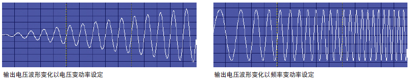 Chroma 61500系列可编程交流电源供应器可以让使用者设定电压或频率的输出变动率,当输出的电压或频率改变时,就会依照设定的变动率逐渐达到最终值。这可以帮助使用者验证产品的操作范围,例如可设定频率由47Hz逐渐增加到63Hz,或电压由90V逐渐增加到264V,取代只验证输入90V、115V、230V及264V几个电压点的方式。另外对待测物开机时,用电压由0V逐渐上升的方式来减少输入的浪涌电流,可应用在马达的启动,或多个产品同时开机测试。