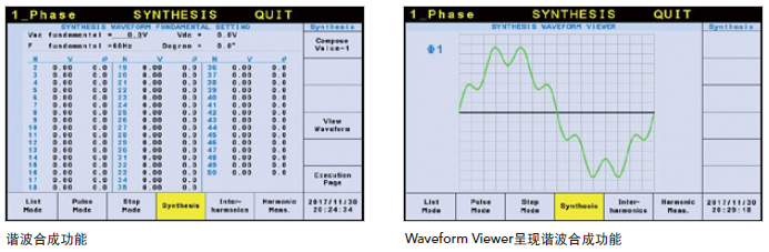 此外,Chroma 61507/61508/61509具备SYNTHESIS(合成)功能,允许使用者以50Hz或60Hz的基本频率来设定多阶的谐波成份,形成周期性的失真波形;另外Chroma 61507/61508/61509亦提供INTERHAR(间谐波)功能,用于基频之外设定另一个非谐波的变动频率成份,从0.01Hz扫描到2400Hz,可帮助发现待测物输入端的谐振点或抗干扰的脆弱点。藉由以上特性,Chroma 61507/61508/61509可输出周期性谐波和非周期性间谐波的失真波形,以完成IEC 61000-4-13符合免疫性测试。