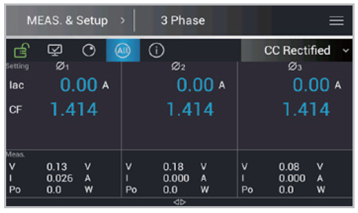 63800R系列能源回收式交流电子负载配备触控式操作萤幕,提供直观的UI介面让用户快速进行多项设定和操作。交流负载的进阶功能如拉载/卸载角度、拉载电流Slew Rate等设定,皆隐藏于右上角More Setting功能,使主设定画面简洁干净。而透过全屏模式,可将所有量测值扩展至全屏,适用于完成输入设定后的观察环节,提供用户更清楚的量测参数画面。