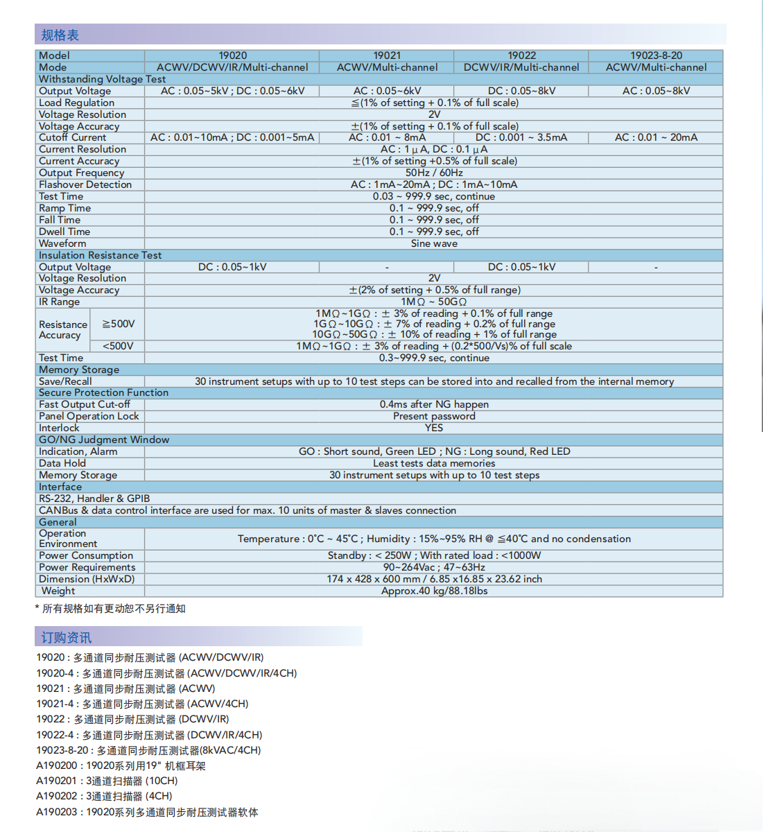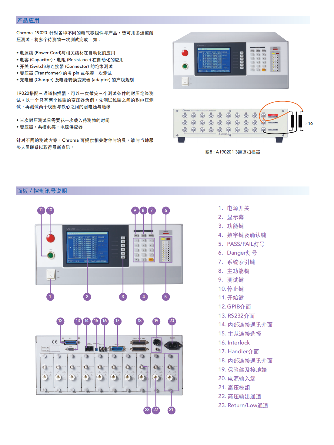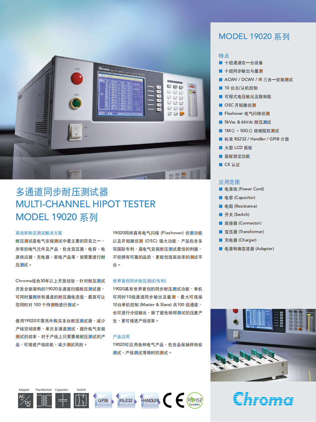19020具有世界首创的同步耐压测试功能,单机可同时10组通道同步输出及量测,最大可连接10台单机控制(Master &Slave)共100组通道,也可进行分组输出,除了避免相邻测试的压差产生,更可增进产线效率。