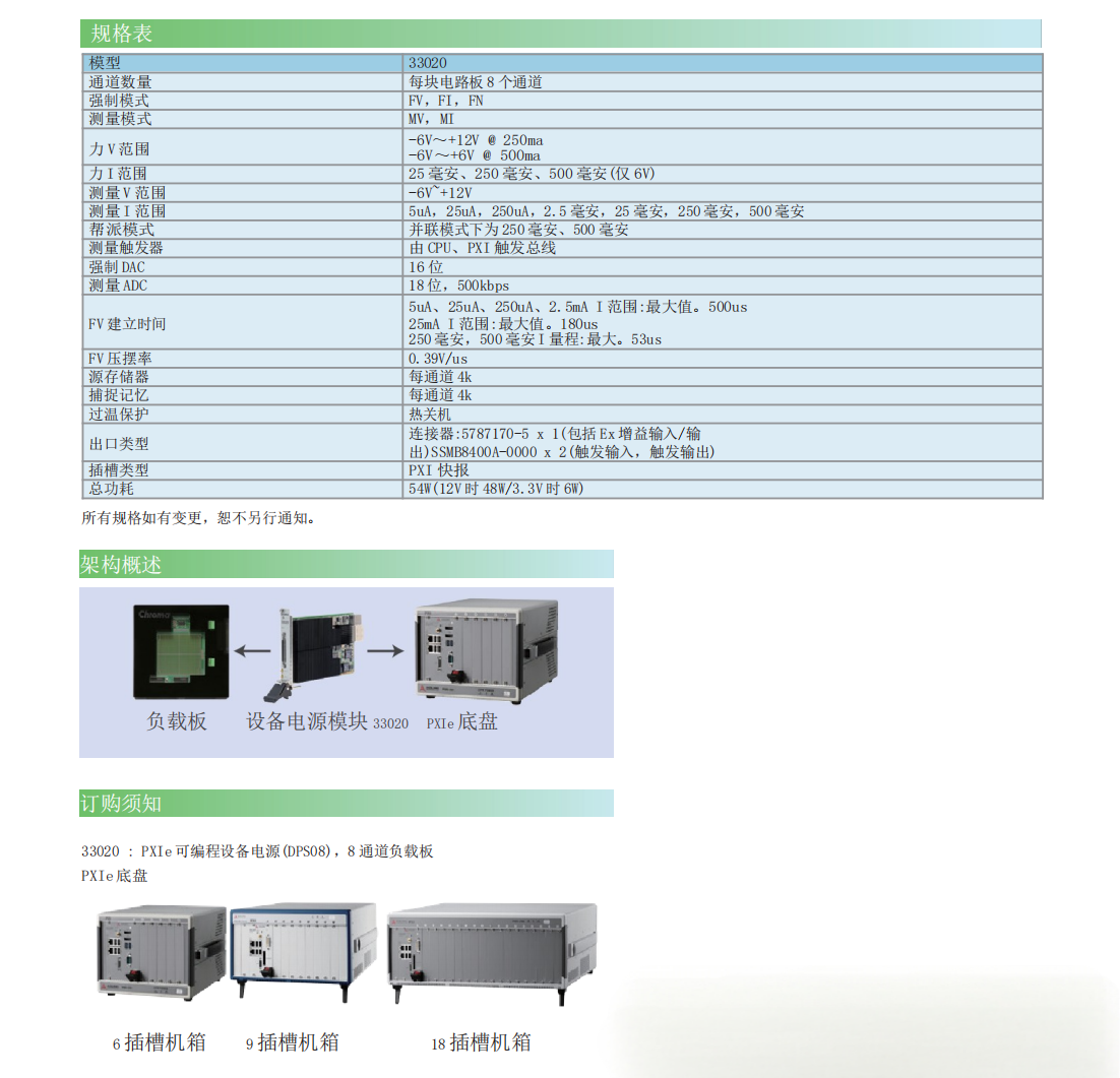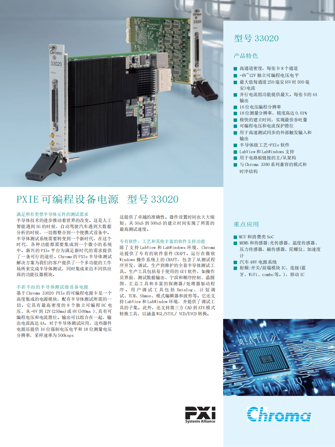 基于 Chroma 33020 PXIe 的可编程电源卡是一个高度集成的电源模块,配有半导体测试所需的一切。它具有最高密度的 8 个独立可编程 DC 电压,从-6V 到 12V(250ma)或 6V(500ma ),具有可编程电压和电流箝位。