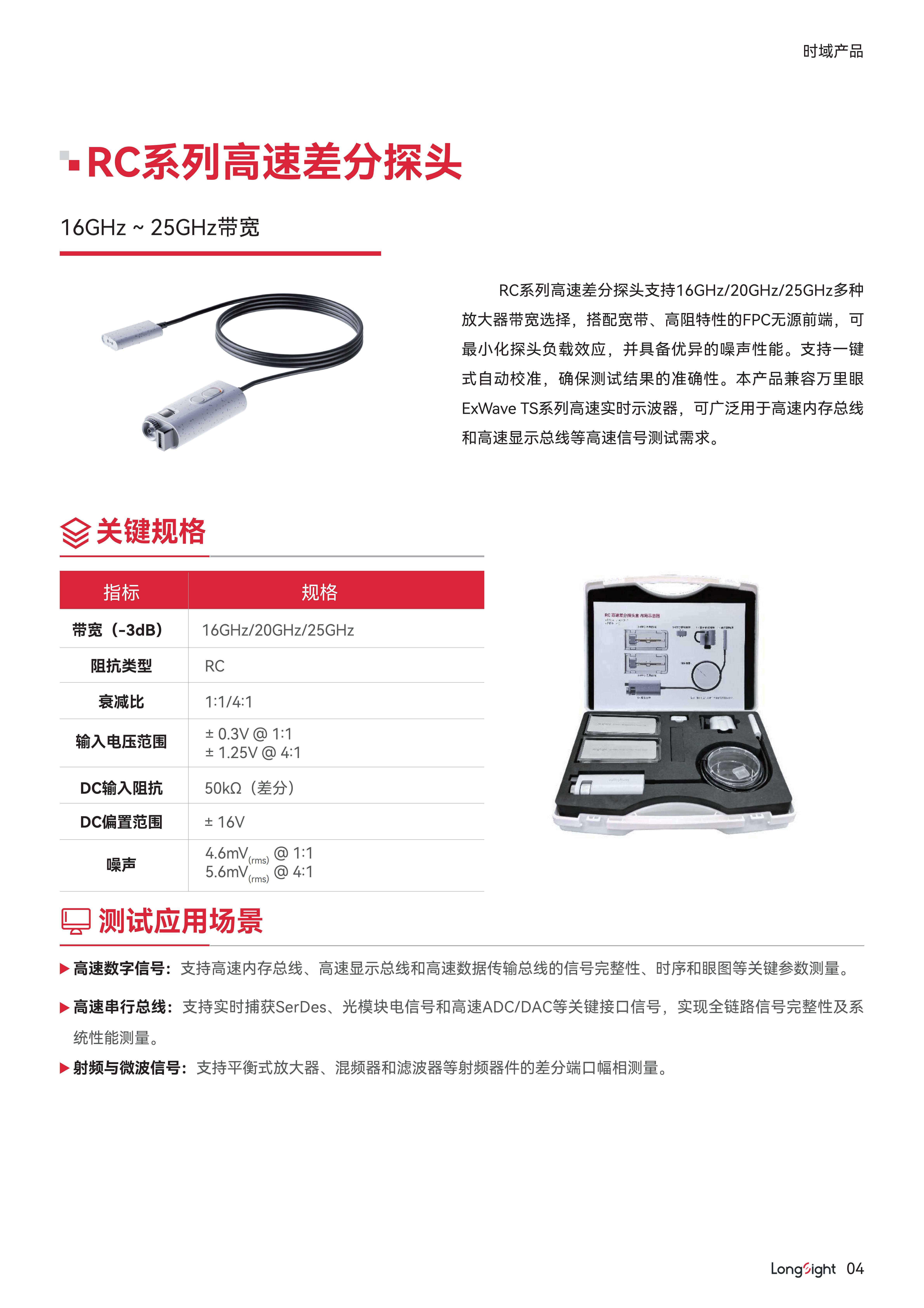 RC系列高速差分探头支持16GHz/20GHz/25GHz多种放大器带宽选择,搭配宽带、高阻特性的FPC无源前端,可最小化探头负载效应,并具备优异的噪声性能。